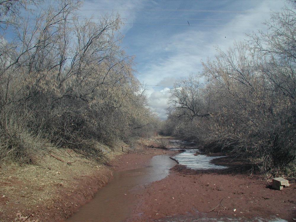 "Before" photo of tamarisk and russian olive on the other side of the bridge