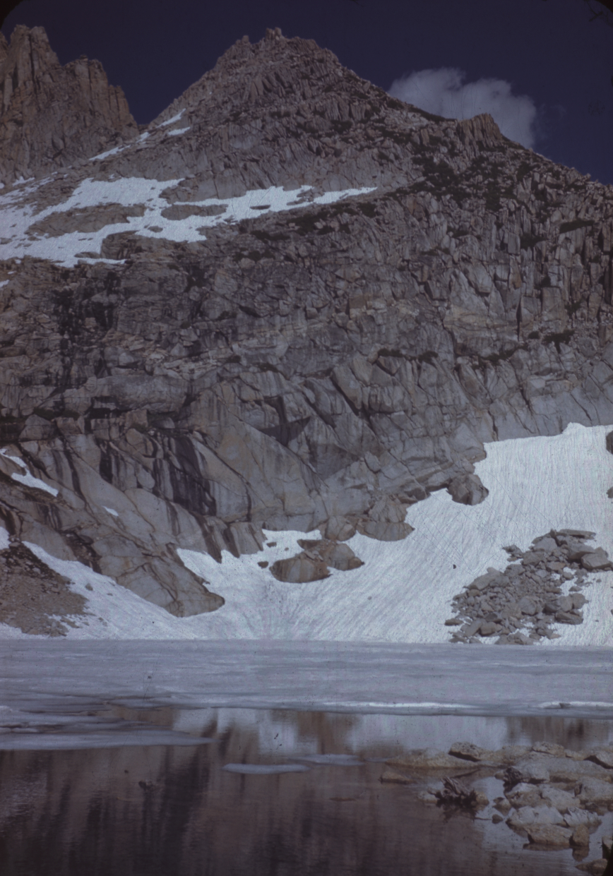 Frozen Lake, e. [east] side Conness, 4-24e-9, Photo: CFB, 7/15/45 [July 15, 1945], Copyright Status: Unknown, C-03-02-012, [mountainside with frozen lake below]