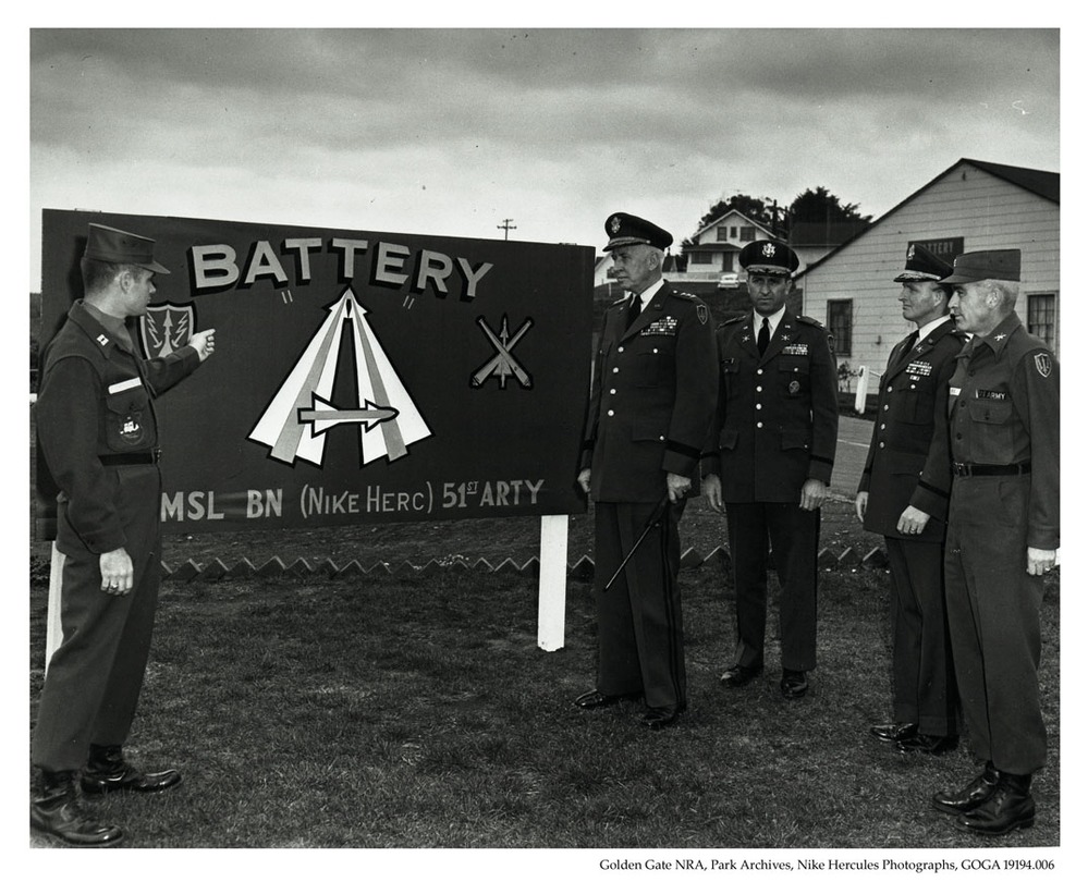 GOGA 19194 006 Nike Hercules battery sign with soldiers and commanding officer surrounding it