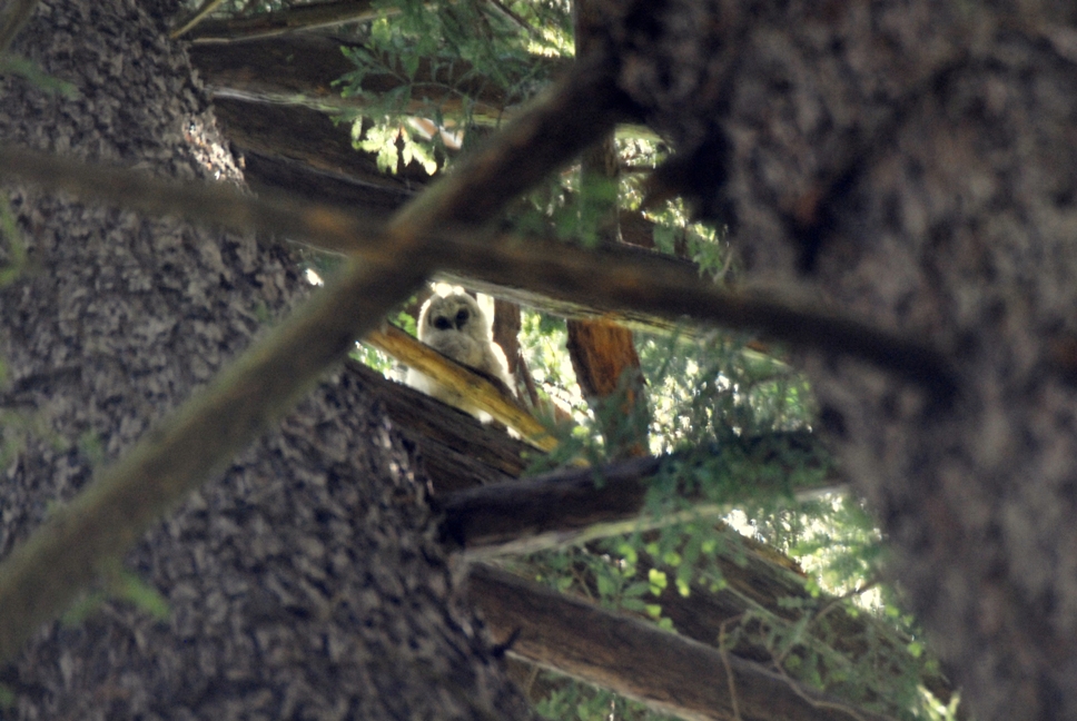 Northern Spotted Owl fledgling high up in a redwood tree, looking down