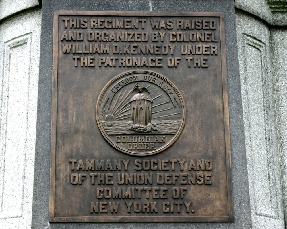 1 of 90 New York Monuments. Indicates position held morning July 2, 1863 & July 3, 1863. Located E side Hancock Ave near Copse of Trees. LF&RF markers 99' & 48' N-S of Mn, respectively. || Mn & 2 flank markers. 3 part stepped base, 1st 12'sq. 2 part shaft, 1st: excised polished letters, 2nd: face w/ polished excised letters, bronze medallion, other 3 bronze tablets. Top: bronze statue & teepee. All 27'10"H. LF&RF 1'6"x11"x1'9"H.