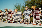 Folklórico dancers at La Fiesta de Tumacácori, kids in costumes, masks, and holding canes