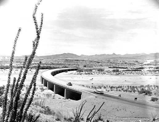 The Tornillo Creek Bridge, Big Bend National Park, recently constructed under the NPS Mission 66 program, at times seems to cross a dry river, with certainly no water in sight. But sudden rains, common to the area, are capable of turning a dry bed into a raging torrent.