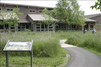 Since the mid-1990s, Cuyahoga Valley Environmental Education Center has offered a variety of summer residential camps. River Run - Theatre: "Fantasy in the Forest" is provided in partnership with Magical Theatre Company. Children entering grades 5-10 work with professional faculty to develop their performing arts skills in acting, voice, movement, and stage combat. The short performances are outdoors and integrate into the natural setting of the CVEEC campus. || Campers walk outside November Lodge, the main activities building at CVEEC.