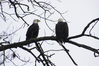 Two mature eagles sit on the bare branches of a tree. Eagles have dark brown, nearly black, wing and body feathers and white heads and tail feathers. Behind them, the sky is cloudy, a nearly-white grey color. One eagle has its back to the camera, the other sits at a side profile, with its eye and yellow break clearly visible.