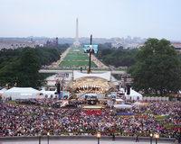 A crowd gathers in front of a bandshell with the National Mall and Washington Monument in the background.