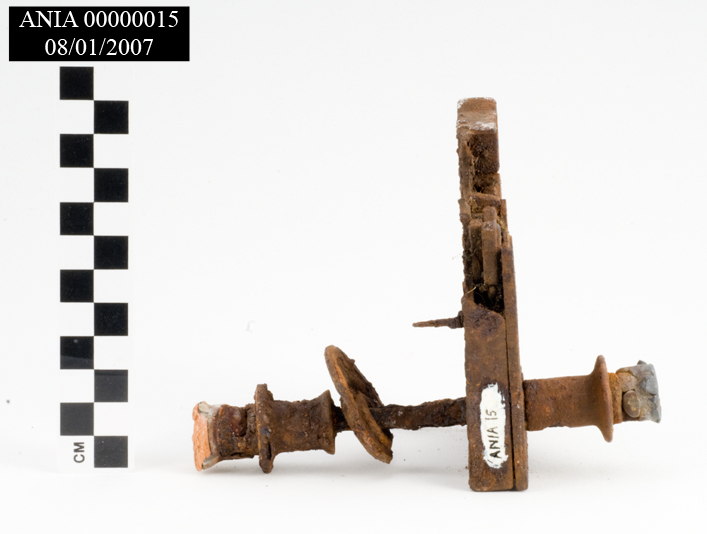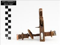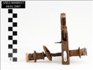 Metal door mechanism with extensions on either side for door knobs. No markings.<CRVery rusty and dirt encrusted. Broken in many places. Rectangular in shape with metal<CRshaft going through it (L 14.0 CM). Remnants of ceramic door knobs on either end.<CR<CR<CRCondition: Very rusty. Delicate.