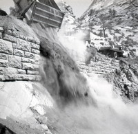 Dump truck dumping dirt over retaining wall during repairs of all along East Rim road. ; ZION Museum and Archives Image 002.05.01-18of19 ; ZION 15933