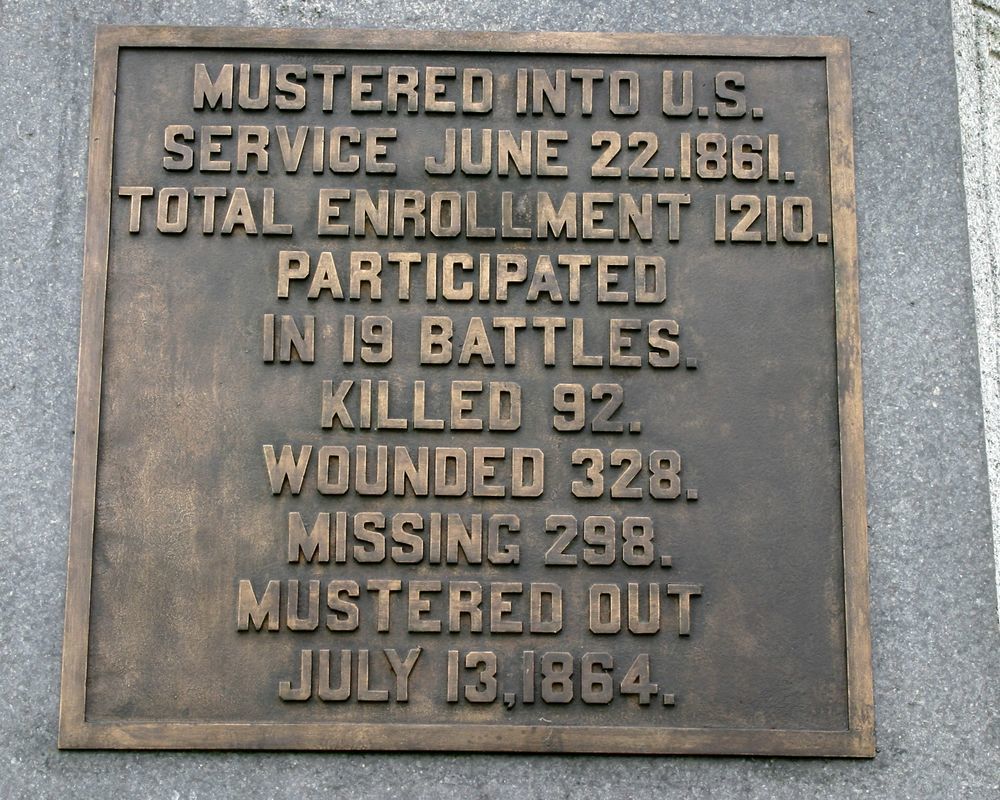 1 of 90 New York Monuments. Indicates position held morning July 2, 1863 & July 3, 1863. Located E side Hancock Ave near Copse of Trees. LF&RF markers 99' & 48' N-S of Mn, respectively. || Mn & 2 flank markers. 3 part stepped base, 1st 12'sq. 2 part shaft, 1st: excised polished letters, 2nd: face w/ polished excised letters, bronze medallion, other 3 bronze tablets. Top: bronze statue & teepee. All 27'10"H. LF&RF 1'6"x11"x1'9"H.