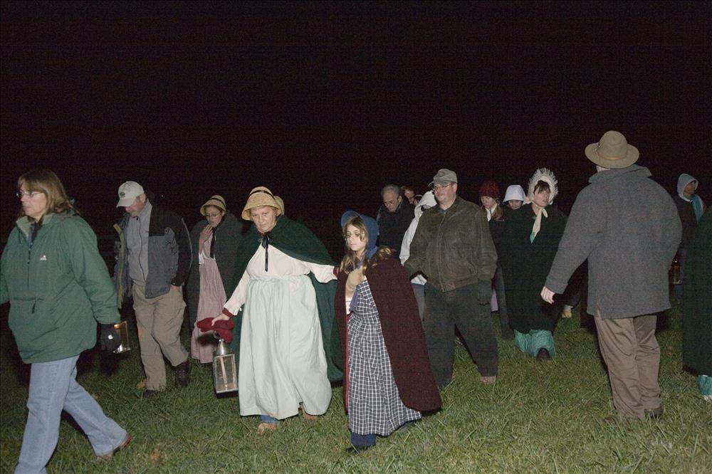 Volunteers, some in costumes and some not, travel by lantern light and practice various scenes. || Cuyahoga Valley National Park interprets Ohio's Underground Railroad heritage because the centerpiece or our park, the Ohio & Erie Canal, was a likely route traveled by runaway slaves. Experience the Underground Railroad, offered each November, places visitors in the role of an escaping slave. The program is part of the National Underground Railway Network to Freedom which recongnizes historic sites, facilities, and programs that have a verifiable association to the Underground Railroad. The photos show volunteers at the dress rehearsal.