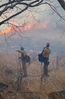 Two firefighters monitor the prescribed fire as it slowly moves downhill.