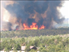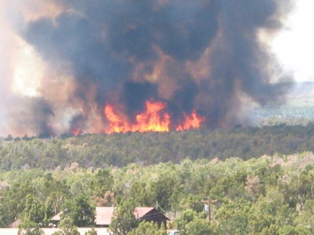 Full fire with black smoke advancing on buildings on the first day of Long Mesa Fire, Mesa Verde National Park, July 29, 2002