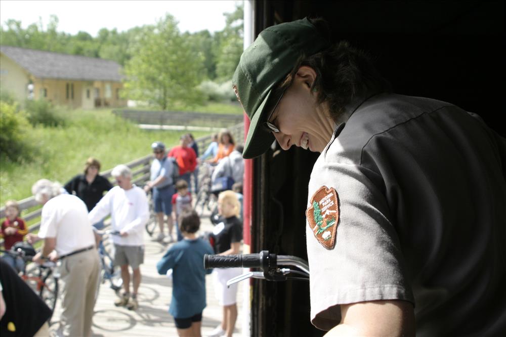 Ranger loads bikes on trains