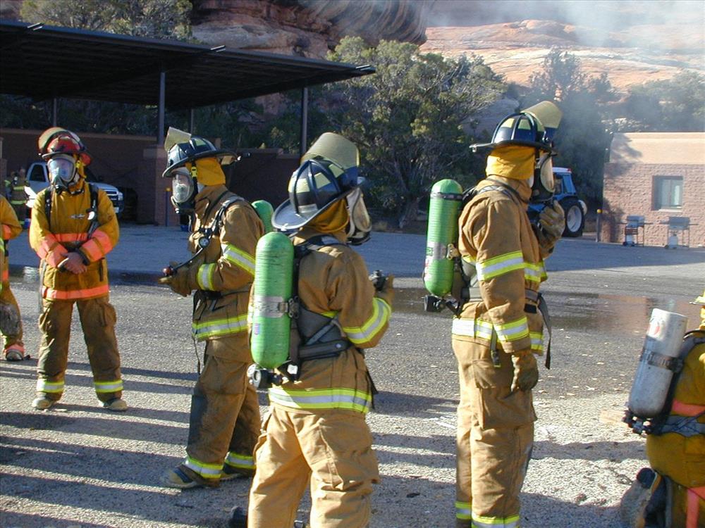 Firefighter crew photos during structural fire training at Mesa Verde National Park, 2001
