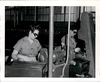 Black and white photo of two white women operating machinery in a factory. They are wearing protective goggles.
