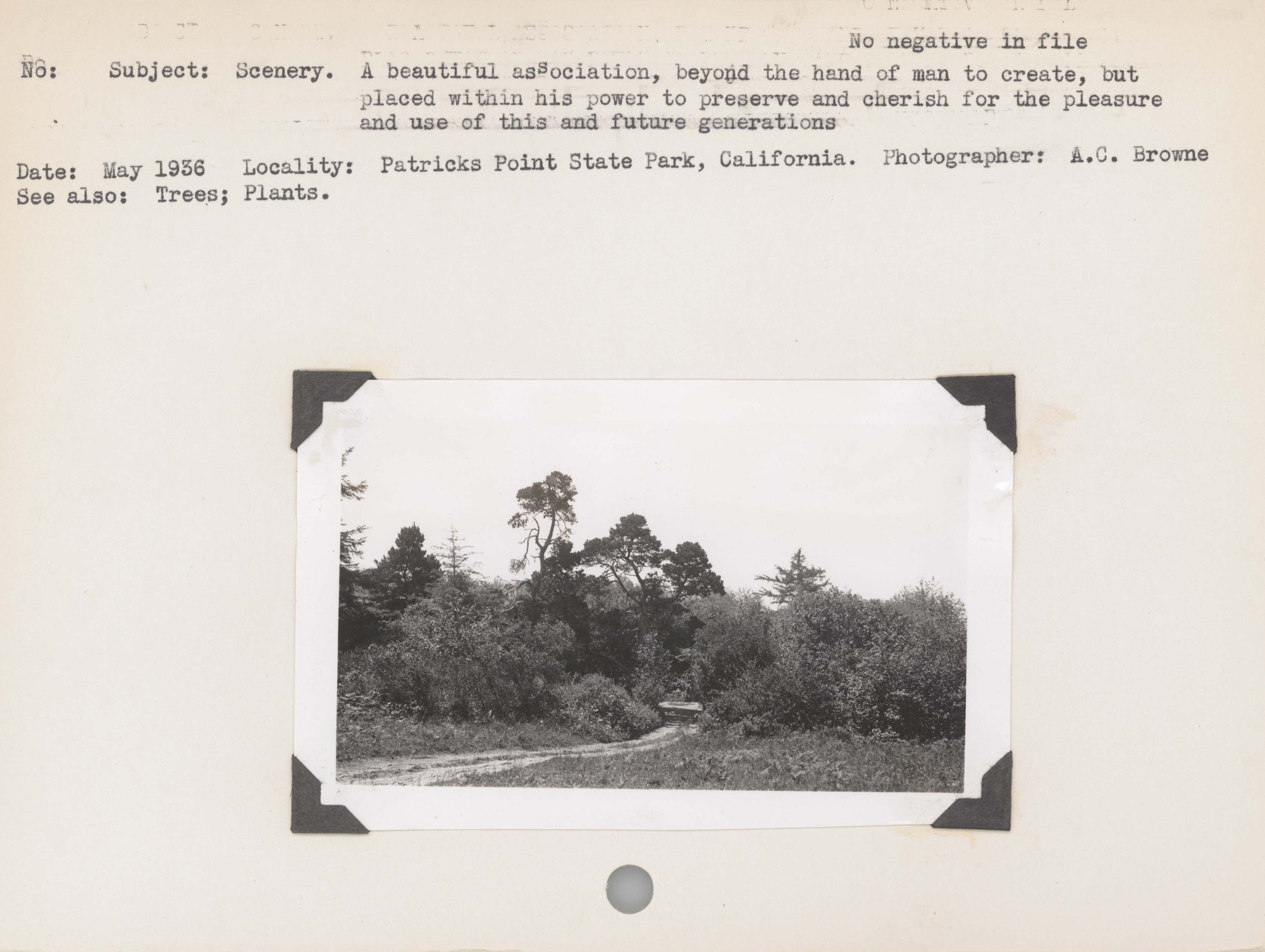 Scenery – A beautiful association, beyond the hand of man to create, but placed within his power to preserve and cherish for the pleasure and use of this and future generations. See also: Trees; Plants. No negative on file. Locality: Patricks Point State Park, California.