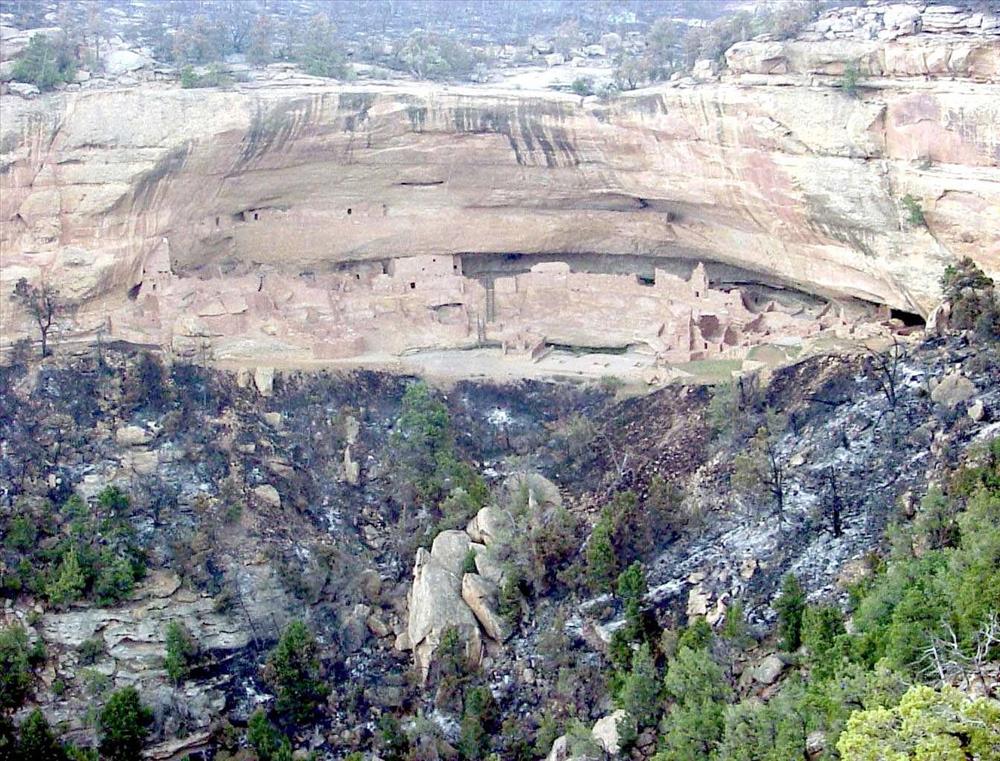 Long House is the second longest cliff dwelling site at Mesa Verde. While it did not sustain damage during the Pony Mesa fire directly, a bridge leading to the site was destroyed and fires burned right up to the edge of the ruins.