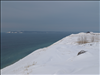 View of snow covered dunes and bluffs and Lake Michigan