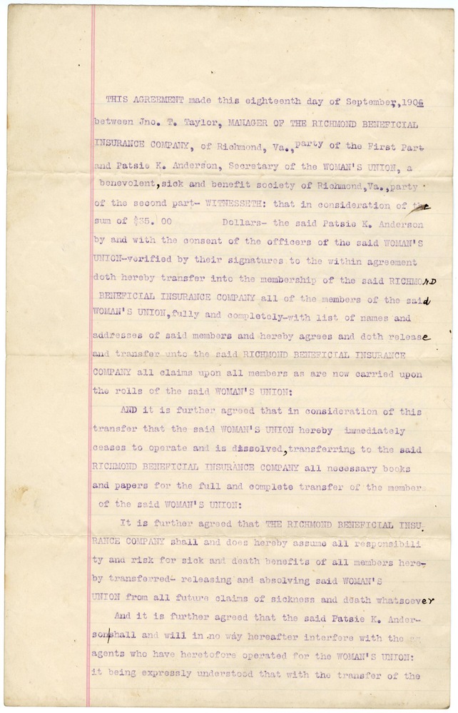 Agreement between Jno. T. Taylor, Manager of the Richmond Beneficial Insurance Company and Patsie K. Anderson, Secretary of the Woman's Union stating that Women's Union transferred all its members to the Richmond Beneficial Insurance Company and was then dissolved. The agreement was witnessed and signed with seals by the Woman's Union's members, including Walker.