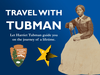 Graphic with white text on a blue gradient background reads "Travel with Tubman: Let Harriet Tubman Guide you on the Journey of a lifetime." Beneath that text is a colored version of the National Park Service Arrowhead and the National Underground Railroad Network to Freedom Logo. To the right is an image of a young Harriet Tubman sitting in a chair. She wears a long dress, her hair is pulled back with a middle part, and she stares into the camera with a stoic expression.