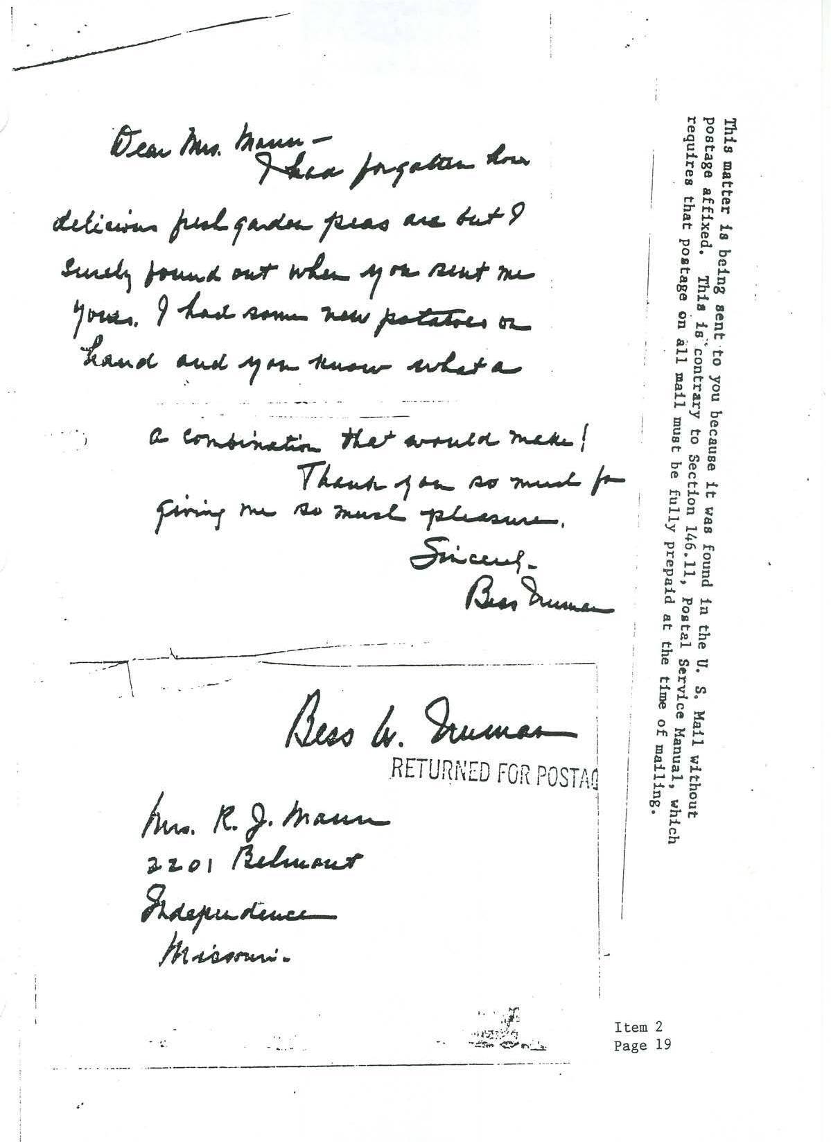 Bess W. Truman letter to Lola Mann concerning gift of fresh peas.