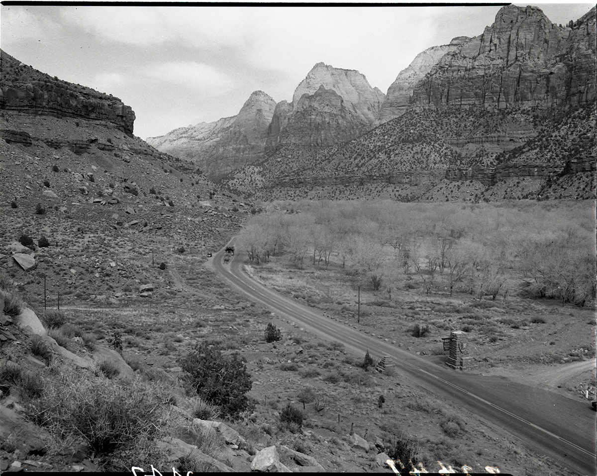 Park road at intersection of Oak Creek Road and main park road (State Route 9). ; ZION Museum and Archives Image 002_10002 ; ZION 7508