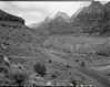 Clearing of right-of-way for new Highway 1, from South Entrance to Virgin River Bridge (Canyon Junction). The Beehives and the Streaked Wall in the distance (view north). ; ZION Museum and Archives Image 002_10013 ; ZION 13762