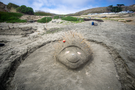 A sand sculpture of a hedgehog with crab shells for eyes and sticks for spines.