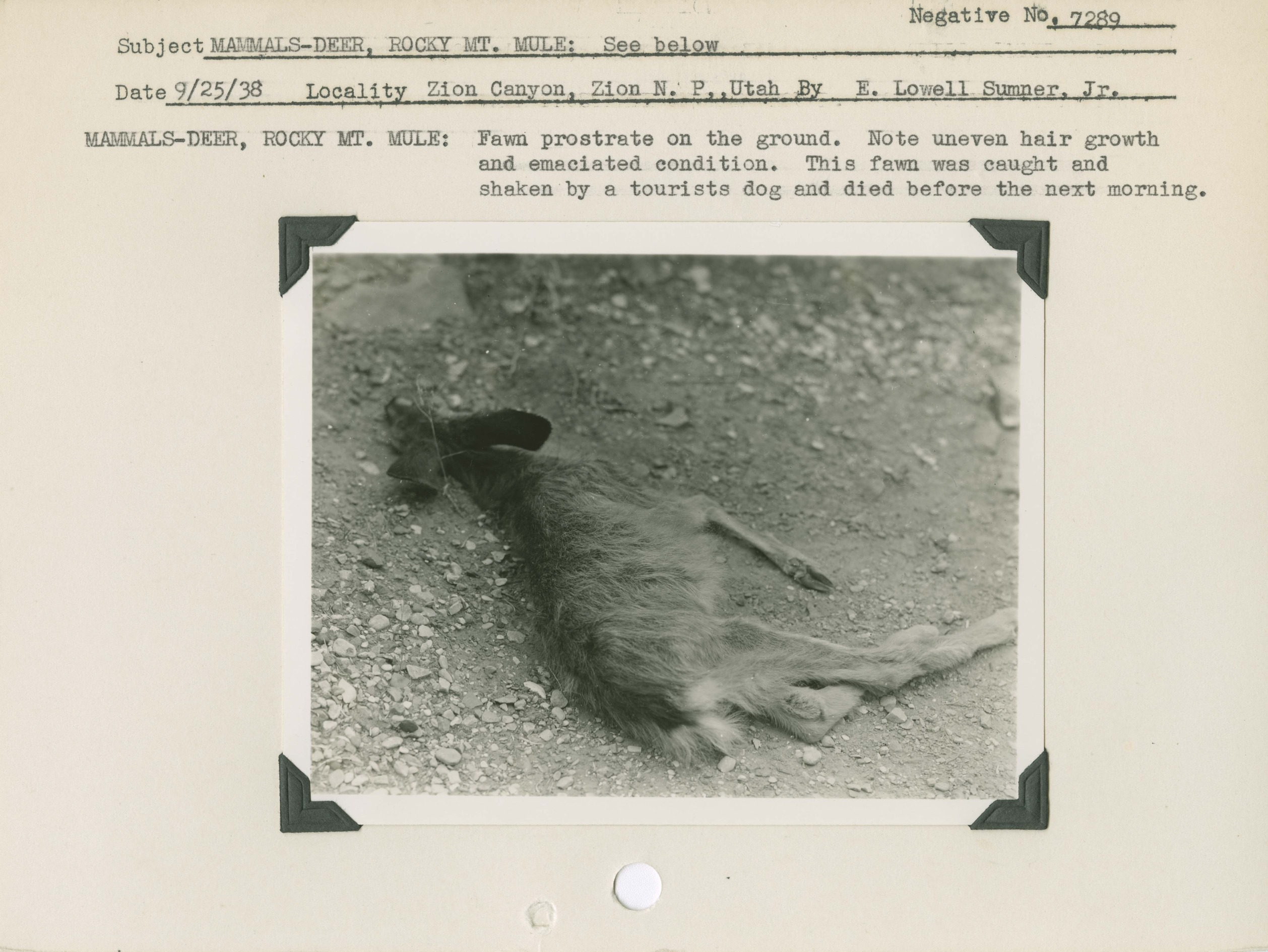 Mammals- Deer, Rocky Mountain Mule: Fawn prostrate on the ground. Note uneven hair growth and emaciated condition. This fawn was caught and shaken by tourists dog and died before the next morning. Negative #: 7289. Locality: Zion Canyon, Zion National Park, Utah.