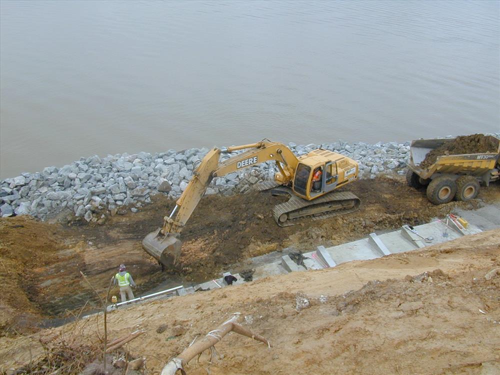 Project included raising the level of riprap around the shoreline of the bluff, constructing an eight foot wide path around the toe of the bluff, constructing a concrete cell wall at the base of the slope, and regarding the top thirty feet of the bluff. The repairs were concentrated along a section of fluff located along the northwest corner of the unit. The repairs generally included raising he height of approximately 650 feet of the existing riprap revetment along the shoreline of the two rivers; removal of vegetation and loose and unstable soil from the toe and face of the bluff; constructing a 450 foot long low height pre-cast concrete retaining wall at the base of the bluff; and then backfilling behind the wall and against the existing slope with an open graded coarse aggregate to control drainage. The top of the wall was built to elevation 16 feet NVGD. A geotextile was used as a filter media to separate the natural soils from the coarse aggregates. The finished slop behind the wall was maintained at a 2 horizontal to 1 vertical slope. An additional 890 tons of riprap was added to the height of the revetment along the project shoreline and thereby provide additional storm protection to the area. The area between the revetment and the retaining was backfilled and a small path was maintained between the toe of the wall and the riprap revetment for public and park access. The finished slope was covered with a geo-cell geo-textile which was filled with topsoil and seeded.