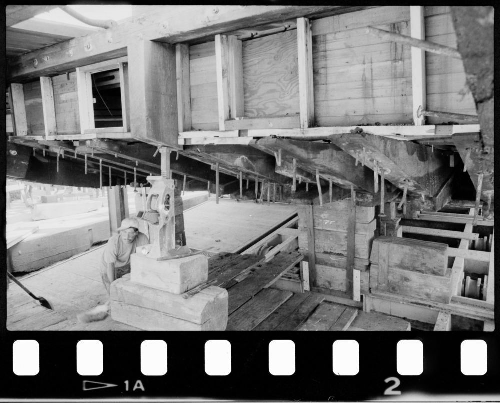 Various views of Alma (built 1891; scow schooner) in drydock, 1987