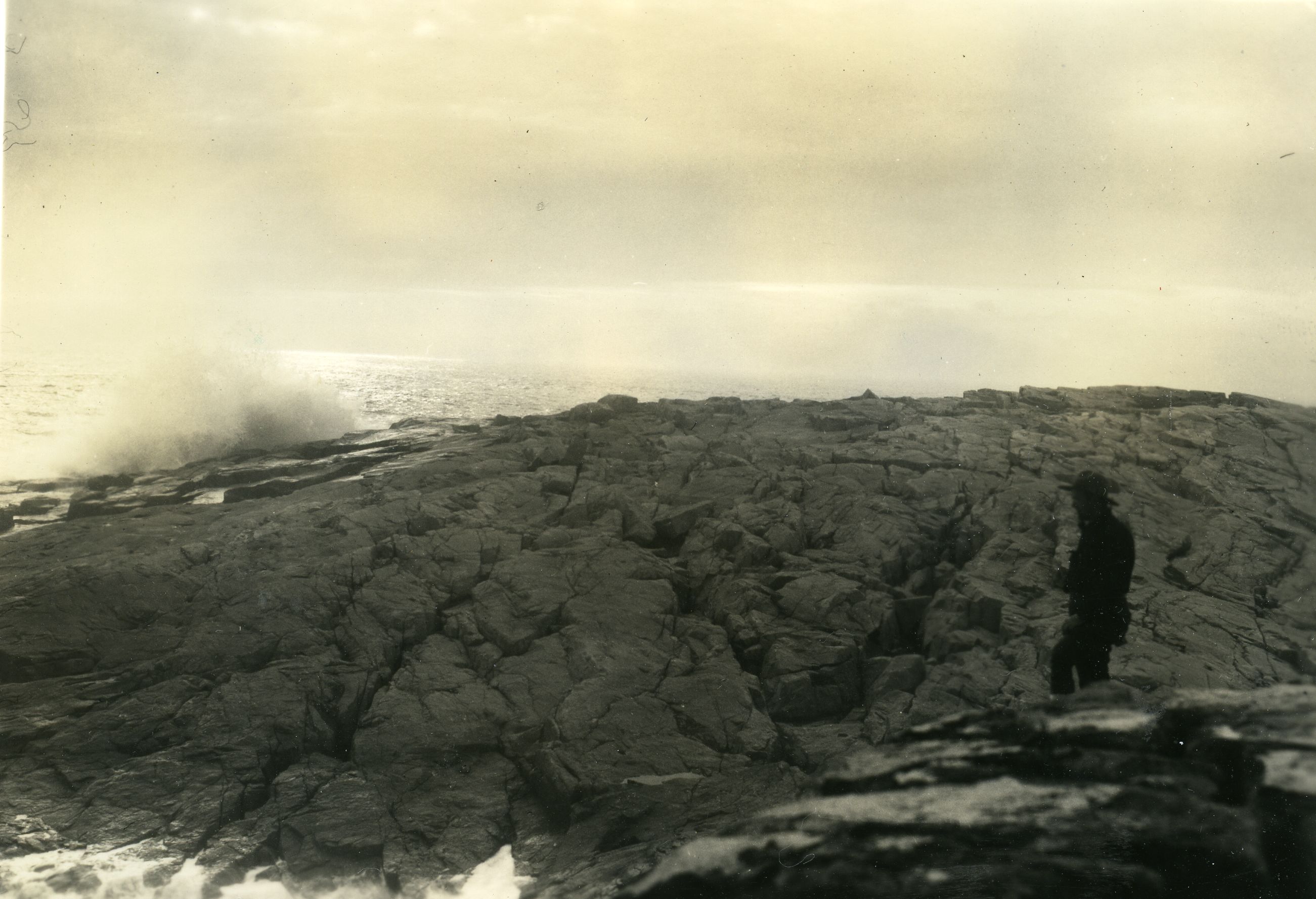 SURF CRASHING AGAINST ROCK. MAN IN LOWER RIGHT CORNER. MIGHT BE DRESSED IN NATIONAL PARK SERVICE UNIFORM.