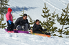 Kids getting into their sleds getting ready to sled down a snowy hill.
