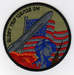 Olive green with black border. American flag in center, red, grey and blue colors. Minuteman III missile diagonally from bottom left corner going over blue field of flag to top right corner. Orange cloud at bottom, representing missile launch. Figure in bottom right with musket representing minute man of the 18th century.