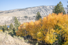 A group of yellow trees grows in a draw with a mountain in the background