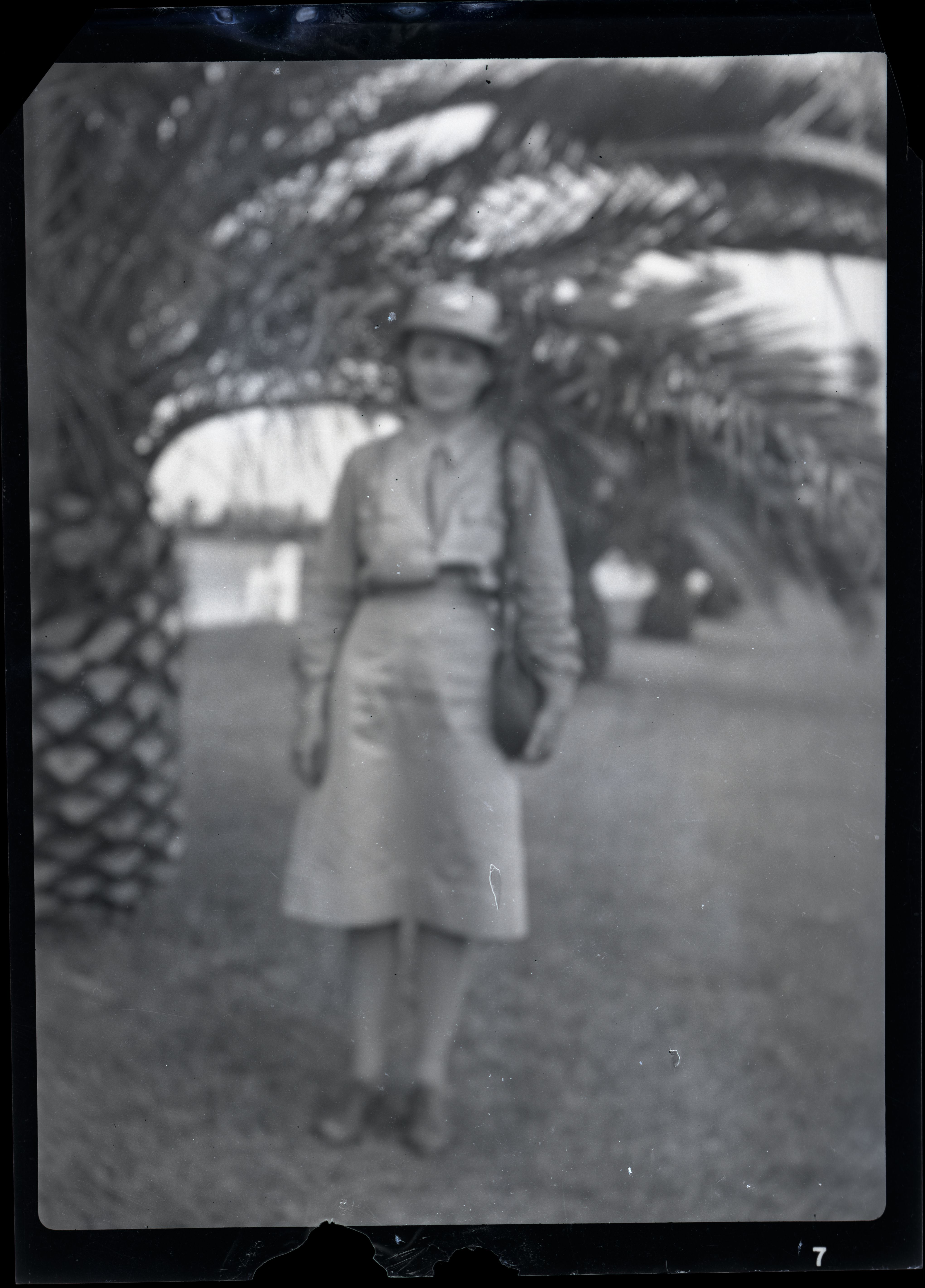 Nitrate negative of woman in uniform standing in front of palm tree. Location unknown. ; BRCA Museum and Archives Image BRCA8875_001_454 ; BRCA 8875