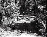 Dirt road from Potato Hollow to Kolob Creek bulldozer blade attempted to push fallen tree. ; ZION Museum and Archives Image 101_02_002 ; ZION 8289