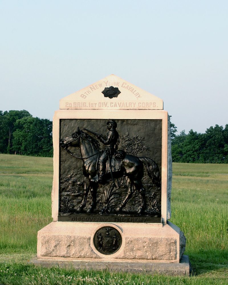 Marks position held by dismounted troopers of 9th New York Cavalry at 8:OO a.m., July 1, 1863 as Battle of Gettysburg opened. 1 of 90 monuments to New York commands in the Gettysburg Campaign. E side of Buford Ave. || Mn & 2 flank markers. Hewn & smooth. Base, 8'6"x4'7", stelae w/ raised letters 10'7" high. Bronze relief, 5'6"x5'2", insignia & bronze NY seal 1'9" dia all on W. Portrait 1'9", info tablet 1'11"x5'3" on E. Flank Markers 1'x1'x1'5". Sword is broken.