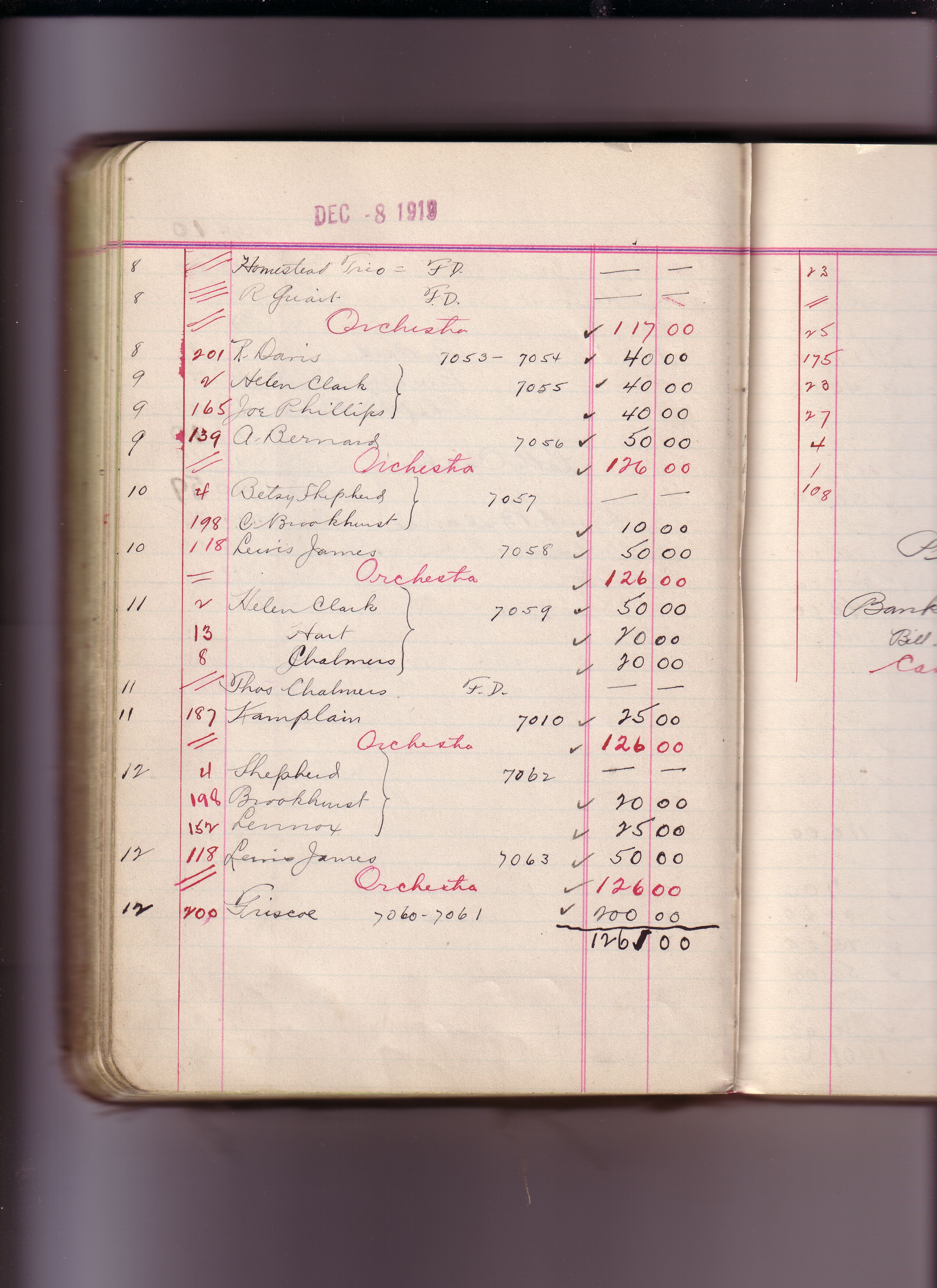 Thomas Edison's New York City Recording Studio Cash Book 16 (of 21), Image 186 (of 305). (Notebook #: PN-18-05-01, NPS catalog #: EDIS 1427), This book documents Diamond Disc matrices 6147 – 7712, expenditures for recording artist fees and other payments authorized by studio manager Walter H. Miller from May 01, 1918 – December 27, 1920. Digitally scanned December 2004 through July 2005 at resolution 300 dpi, 24 bit.