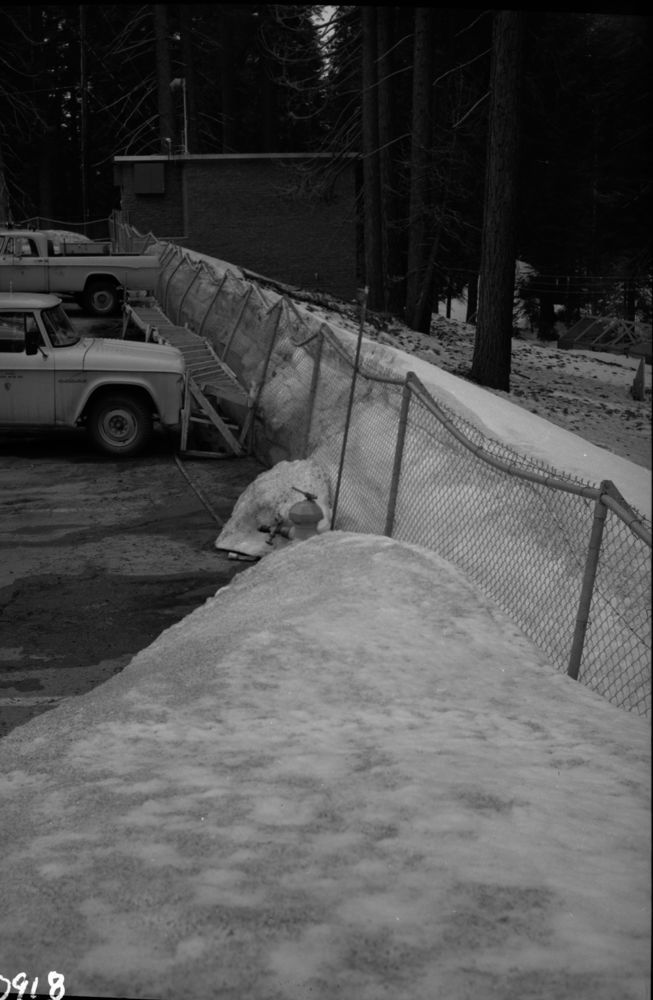 Robert Zink, Grant Grove, KCNP, Record Heavy Snows, Damage to chainlink fence from snow weight, maintenance area. 690424.