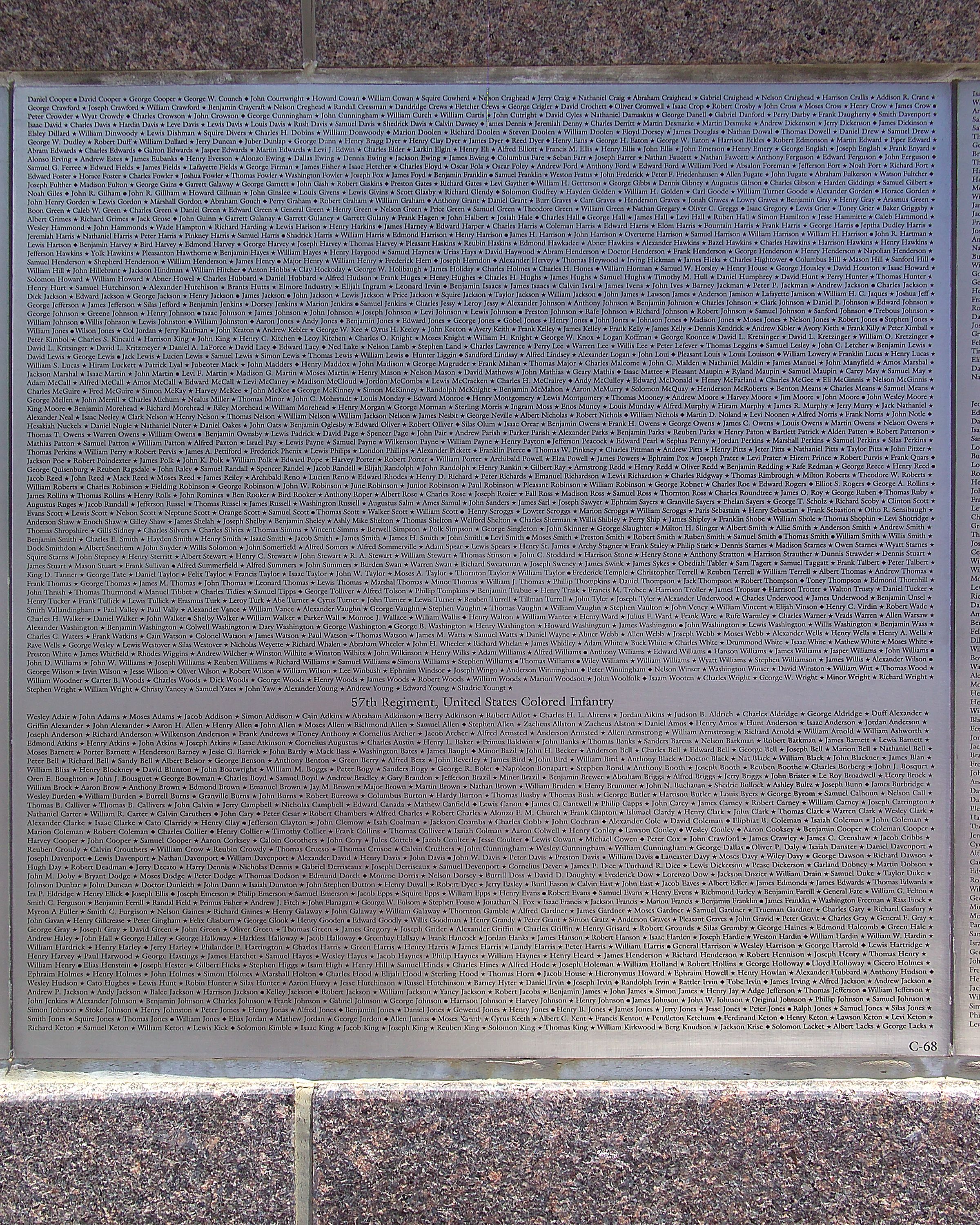 At the center of this monument is a metal sculpture surrounded on three sides by a "Wall of Honor," listing the names of 209,145 United Colored Troops on 166 burnished stainless steel plaques arranged by regiment. The plaques on this record (plaques C68, C69) memorialize the 57th Regiment, United States Colored Infantry.