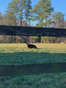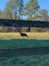 Devon cow, red with two horns, laying in pasture, picture taken between two fence rails