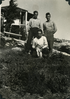 Photo 98 of a souvenir album compiled by Charles C. Hadd, who served as a fire lookout for the United States Forest Service from 1936-1939. His primary post was Sourdough Lookout in the North Cascades. The caption reads: "I, George Rasmussen, Dan Oliver & Duke - 1938". (North Cascades NPS Complex Museum Collection, Assembled Collections, Series I: Skagit Area Photographs, File 001 - Charles Hadd Sourdough Lookout Album, 1936-1939)