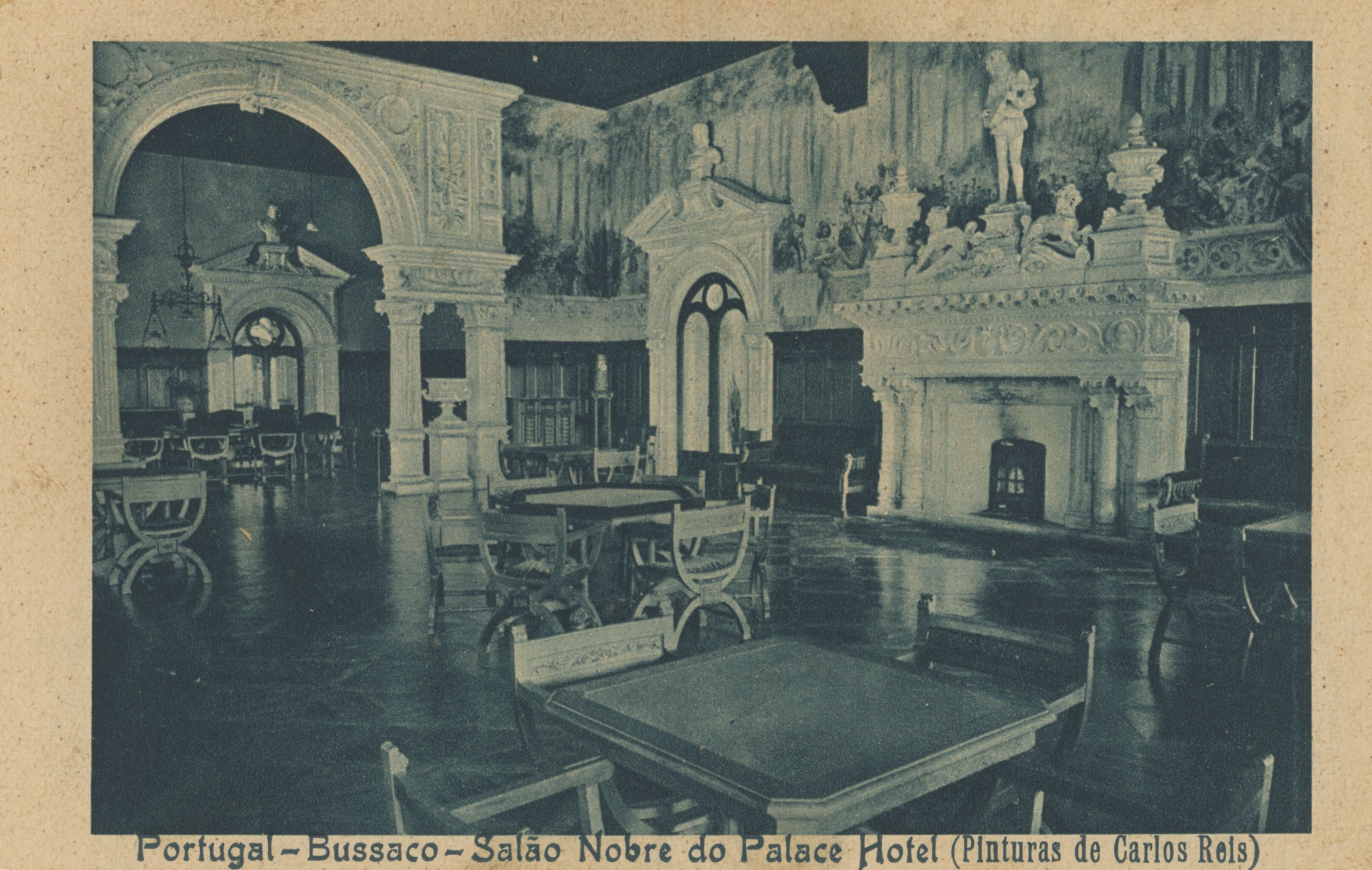 Post card with a printed blue-toned photograph of the interior of a hotel dining room. The interior is vacant and lavishly decorated. Two tall doors are visible with bust sculptures built into the top. Scattered along the marble floor are many tables and chairs. On the right side, a large fireplace at the wall is sculpted with patterns, and two horses, two vases, and a person playing a string instrument is built into the mantle. A mural of a forest scene is painted on the top portion of the righthand wall. Towards the left side, a large decorated archway shows another section of the dining room with tables, chairs, and a low-hanging chandelier. At the bottom, printed writing reads, “Portugal-Bussaco-Salão Nobre do Palace Hotel (Pinturas de Carlos Reis).”