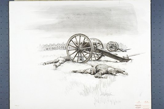 First Battle of Manassas: scene depicts Capt. Charles Griffin's Battery (Battery D, U.S. Artillery) after the fatal point-blank volley from the Confederate 33rd Virginia Infantry.