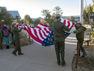 During an outdoor memorial ceremony. four park rangers are taking down an large American flag, and beginning to fold it.
