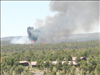 Full fire with black smoke advancing on buildings on the first day of Long Mesa Fire, Mesa Verde National Park, July 29, 2002