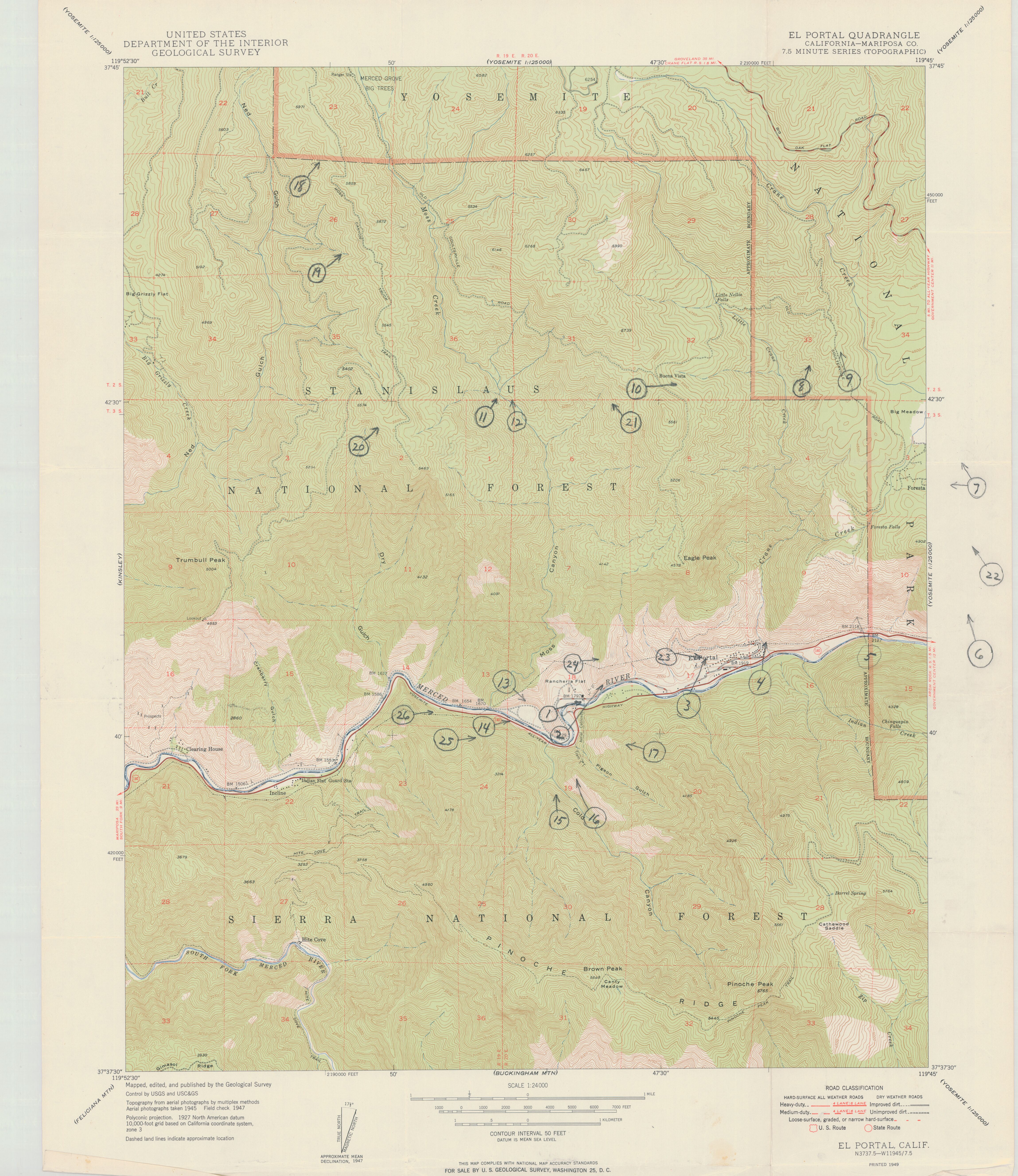 Topographic map of the El Portal Quadrangle with areas around road and in the Stanislaus and Sierra National Forests numbered