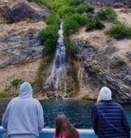 [Alt Text] Park visitors get an up close look at a waterfall into Crater Lake during a boat tour.