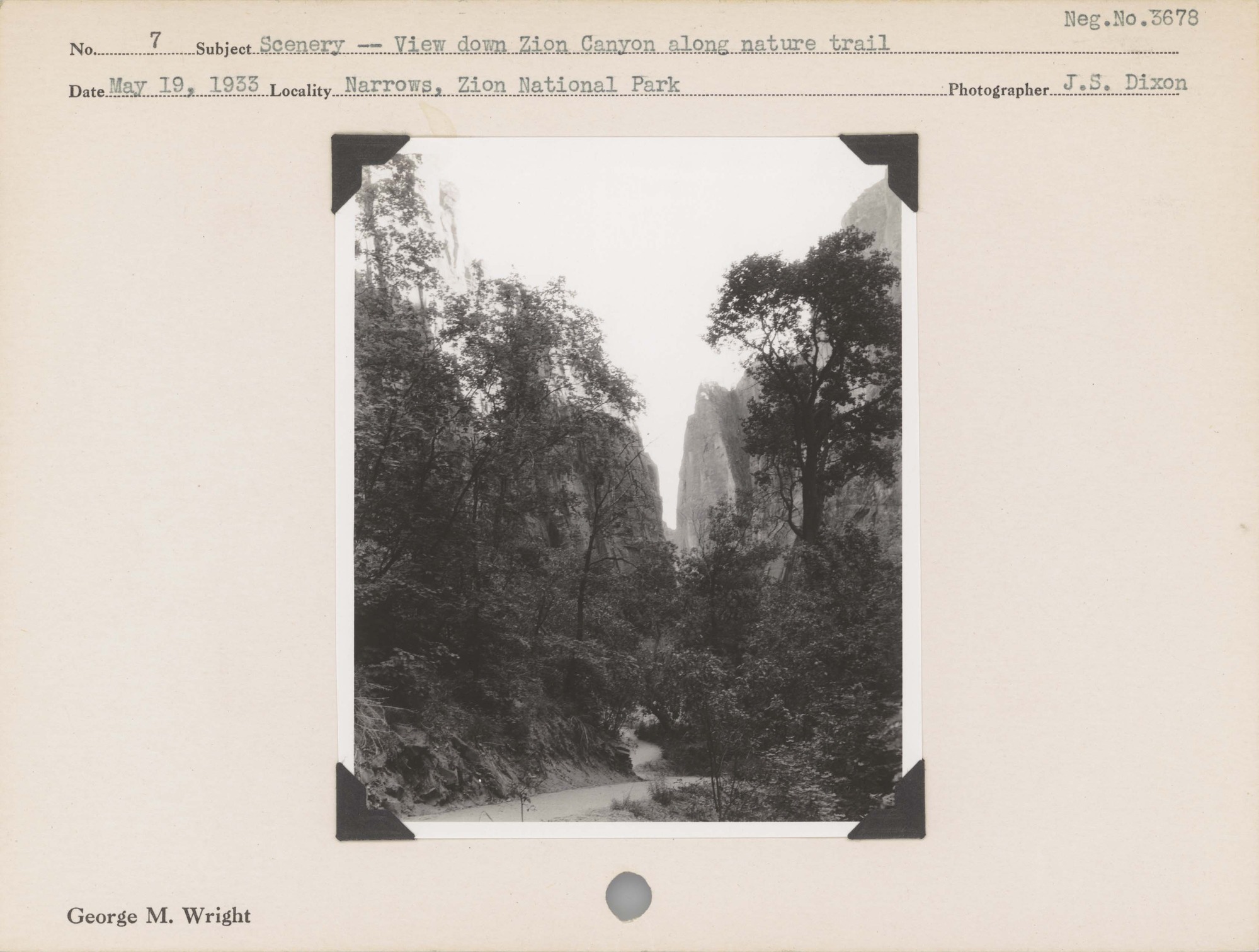 Scenery – View down Zion Canyon along nature trail. Negative #: 3678. Location: Narrows, Zion National Park.